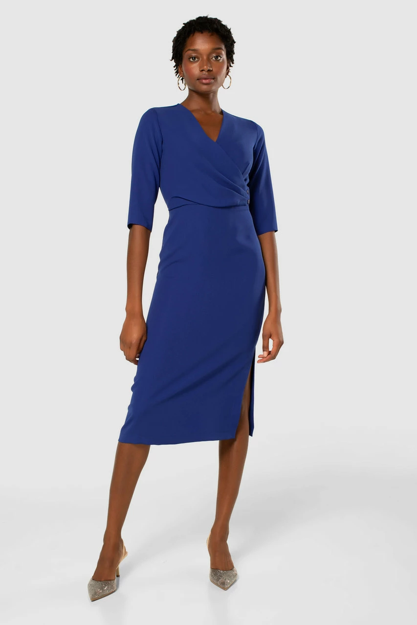 A stylish pencil Dress with a button detail at the wrap front and elbow length sleeves