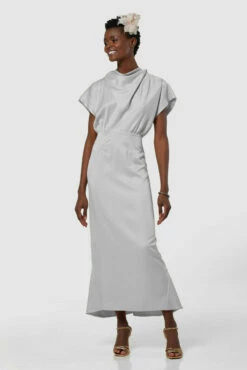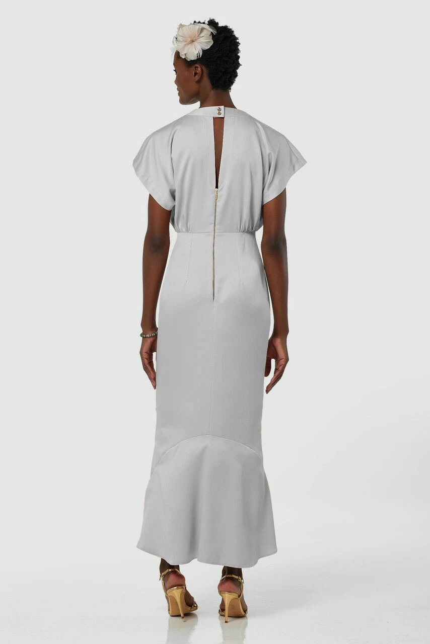 An elegant Bridesmaid Dress that has a high cowl neck, Kimono shaped top with a flowing pencil skirt with a godet at the back.