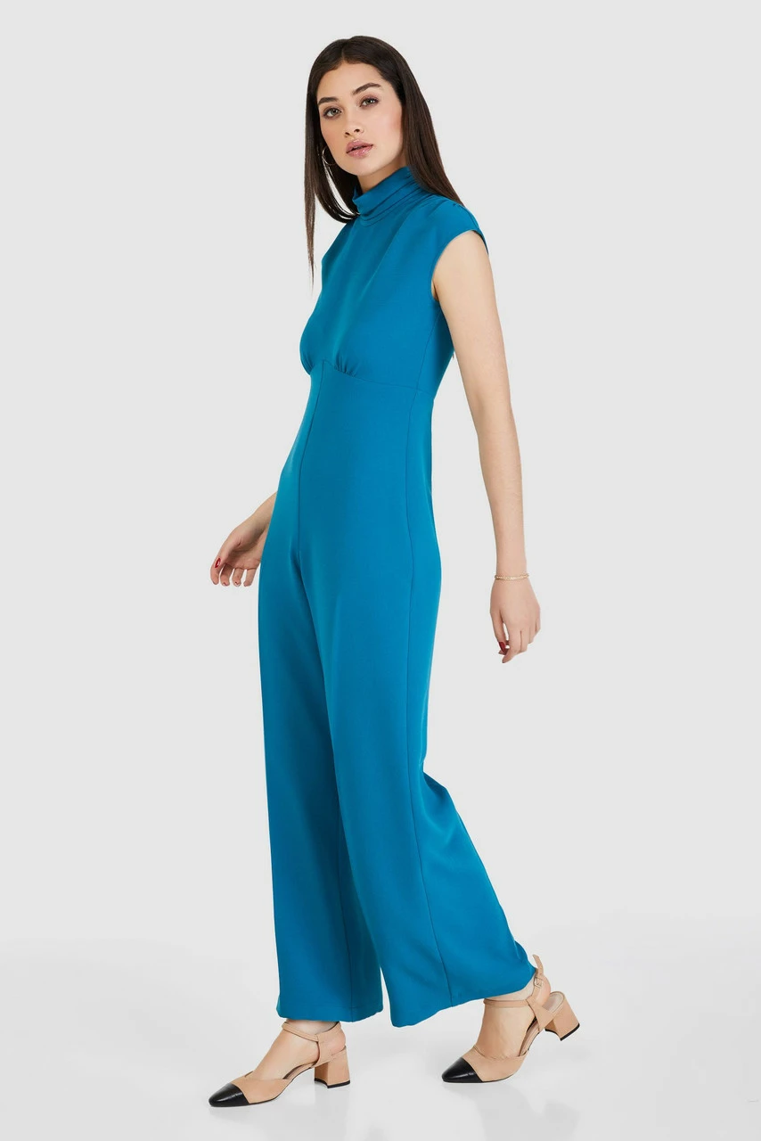 This teal Jumpsuit is perfect for “desk to dinner” dressing. It has a high neck, grown-on cap sleeves and a flattering wide leg.
