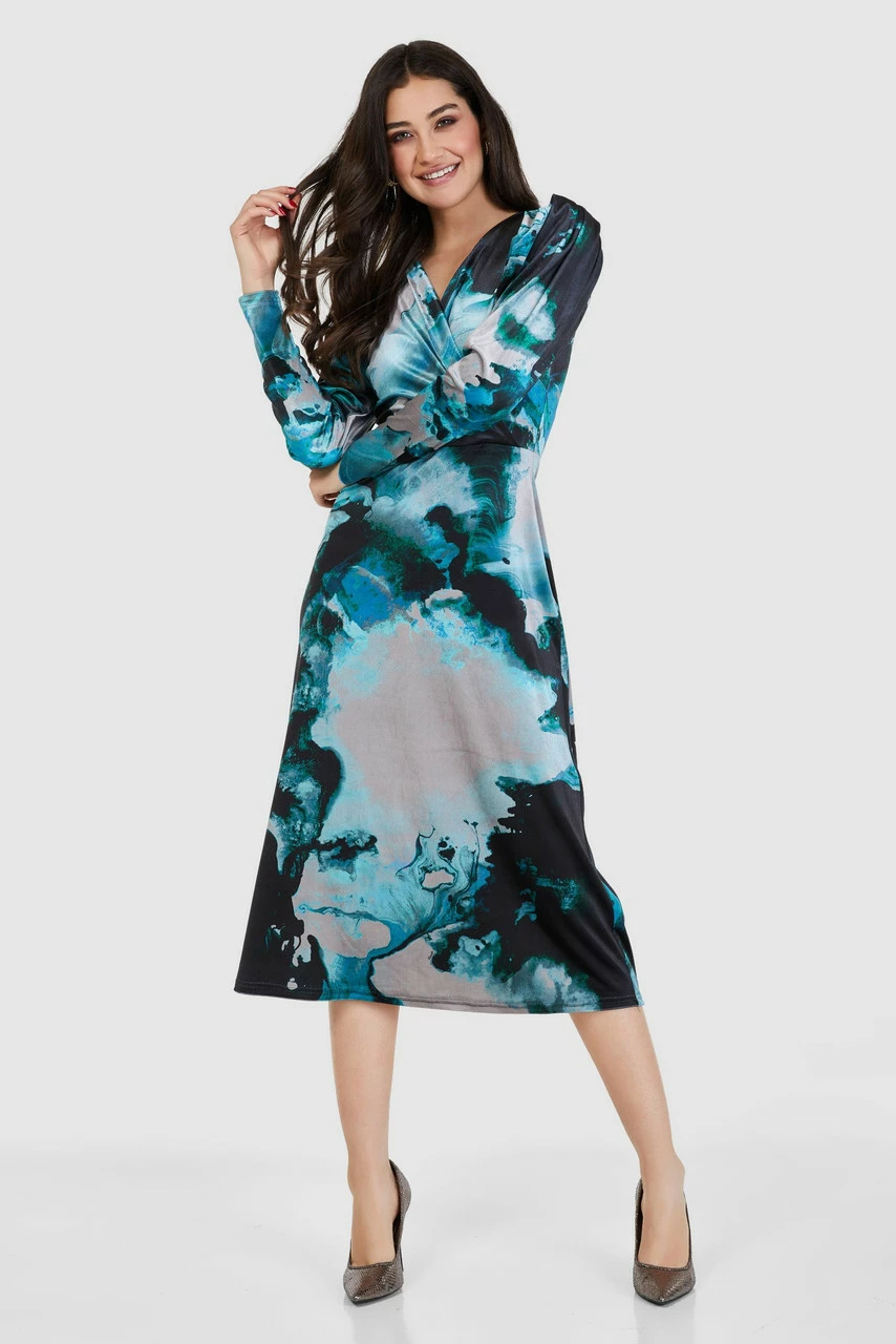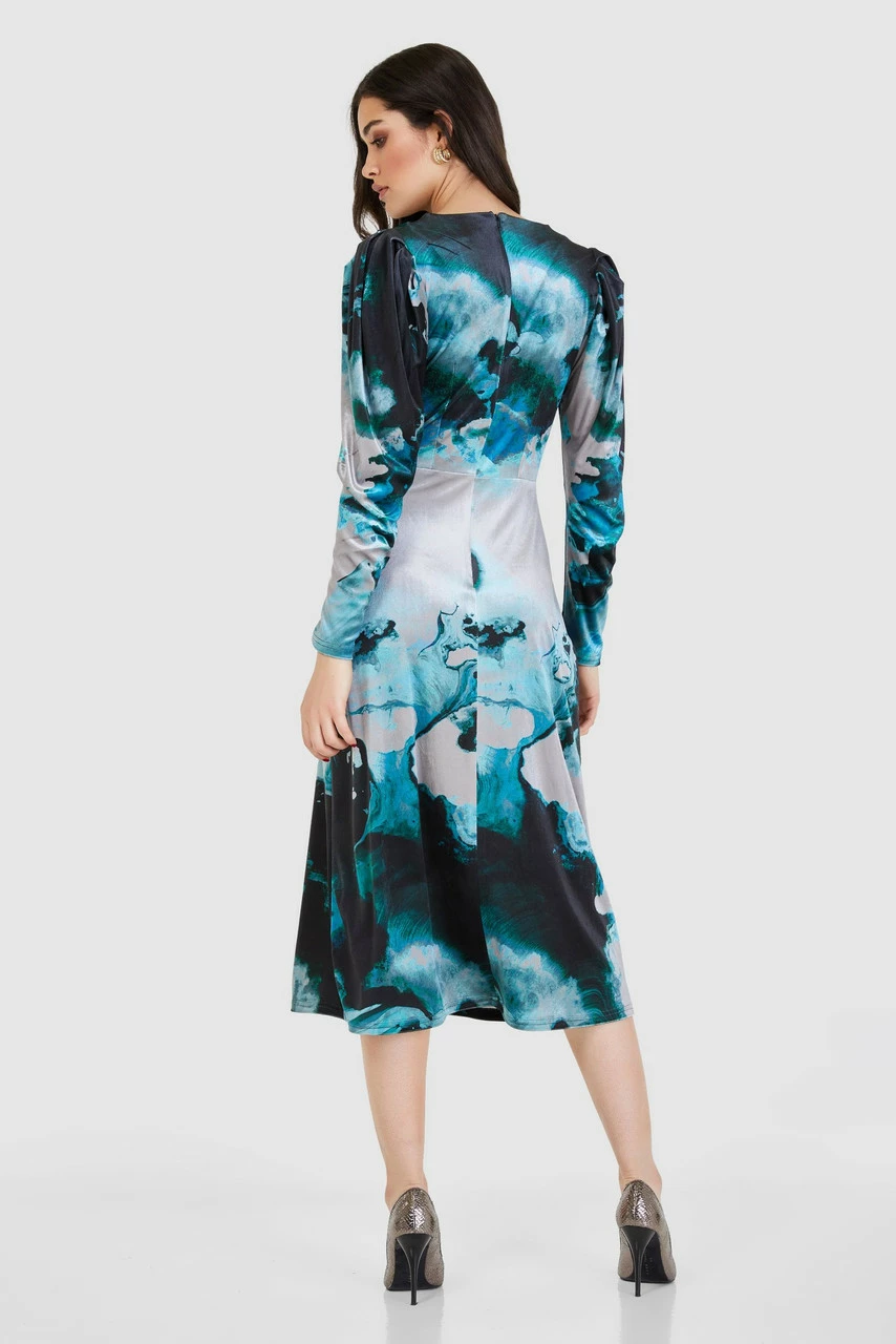 A midi length version of the wrap Dress with puff sleeves in a dark green, teal and silver marble printed Velour.