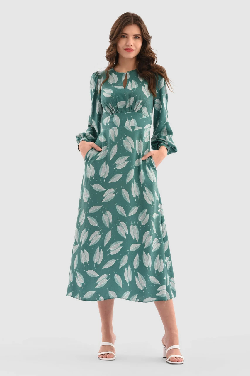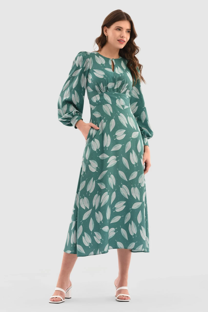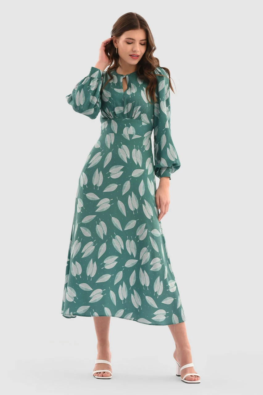 Discover elegance in our Teal Leaf Print Midi Dress. Featuring a delicate leaf pattern, keyhole neckline, and flattering A-line silhouette, this dress embodies timeless sophistication. Perfect for seamless day-to-night transitions.