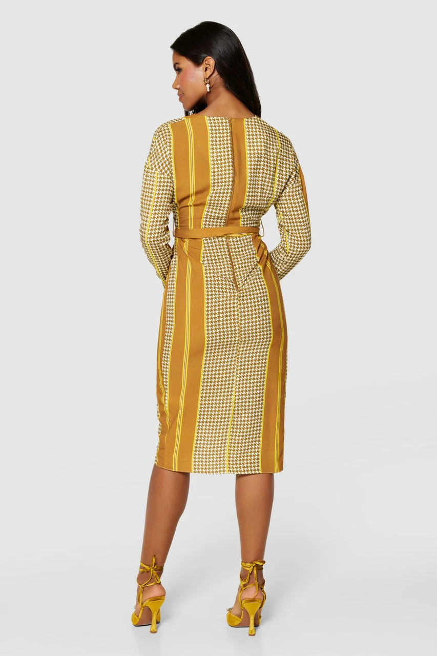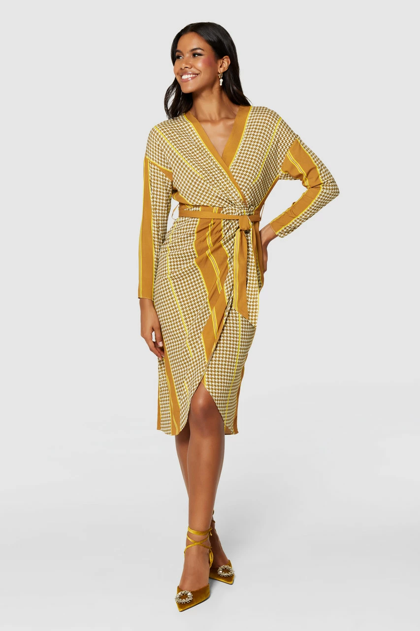 A wrap dress is universally flattering, and the houndstooth and stripe print of this dress is interesting. It has a tie belt to emphasize your waist and a tulip-shaped skirt for ease.