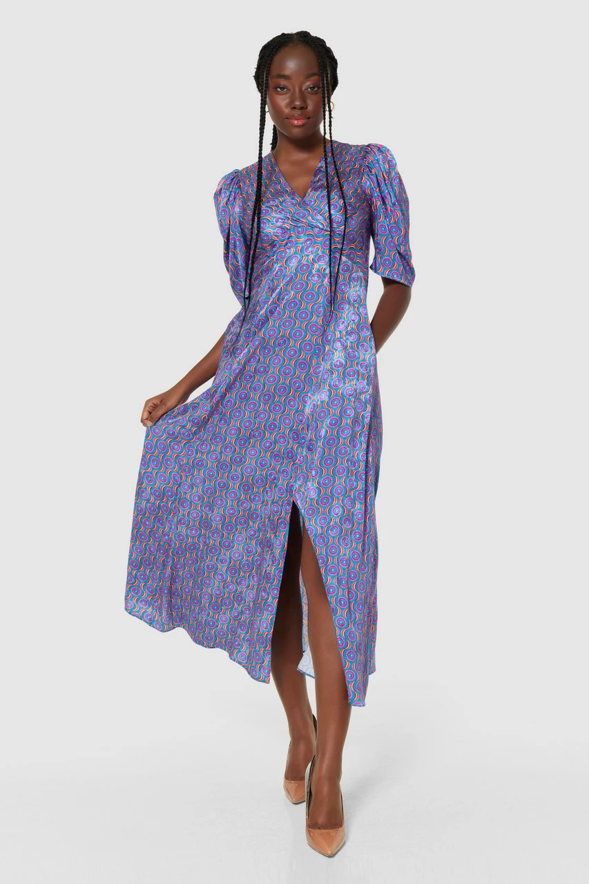A printed satin jacquard dress that is both sophisticated and stylish, The luxurious fabric is eye-catching and adds a touch of glamour to the dress. The midi length and wrap neck are flattering, making this dress a timeless choice. The dress has convenient pockets, which adds a functional touch.