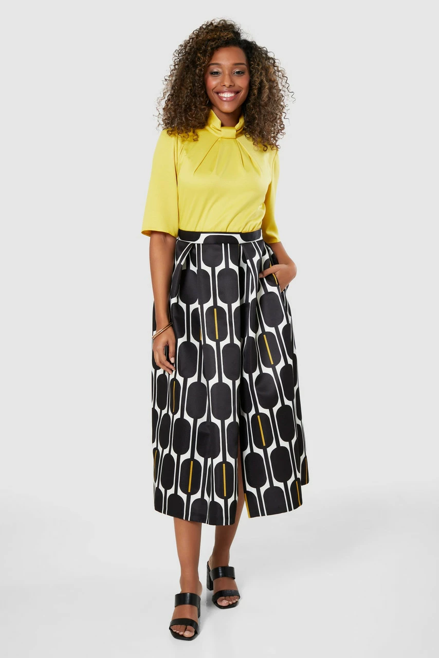 A striking version of our Closet Gold 2-in-1 Dress with a bold printed skirt and mustard top.