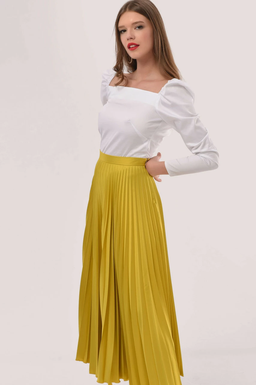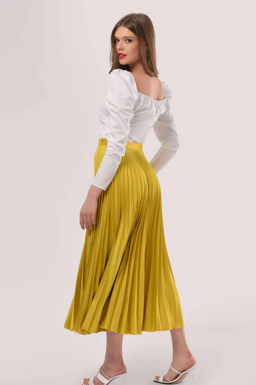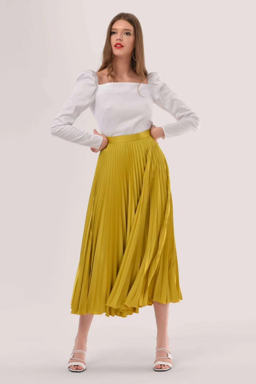 Details: Exquisite, layered pleats, Flared cut hem, High rise waist