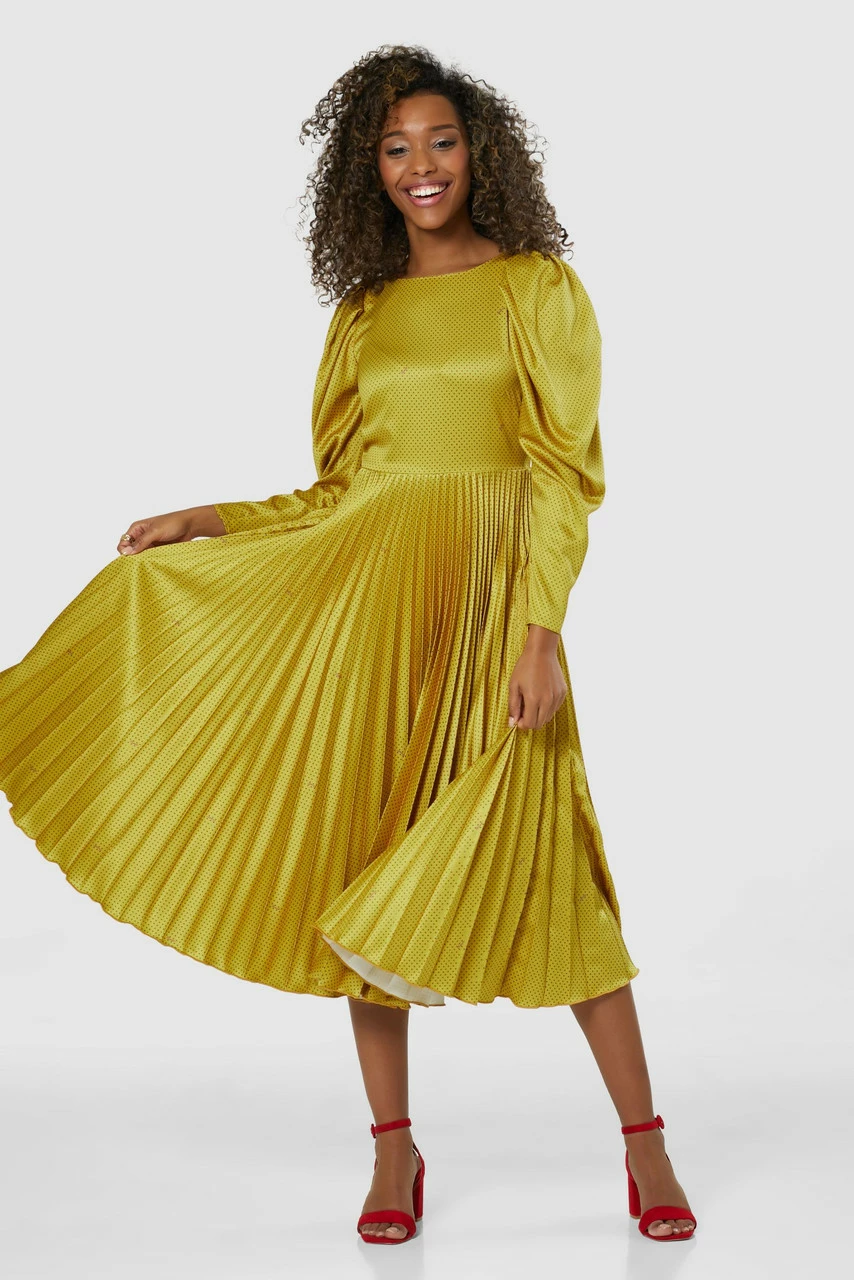 Our bestselling pleated Dress with generously pleated sleeves in a Lime Satin printed with tiny Mauve diamonds.
