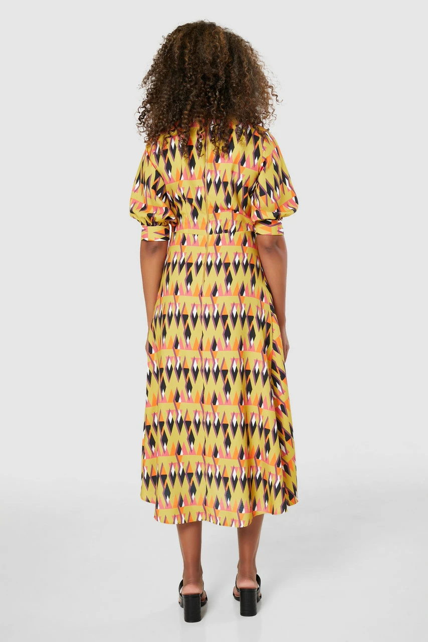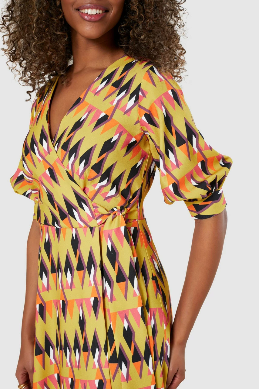 A brightly printed wrap Dress with a puff sleeve, cuff and high/low hem