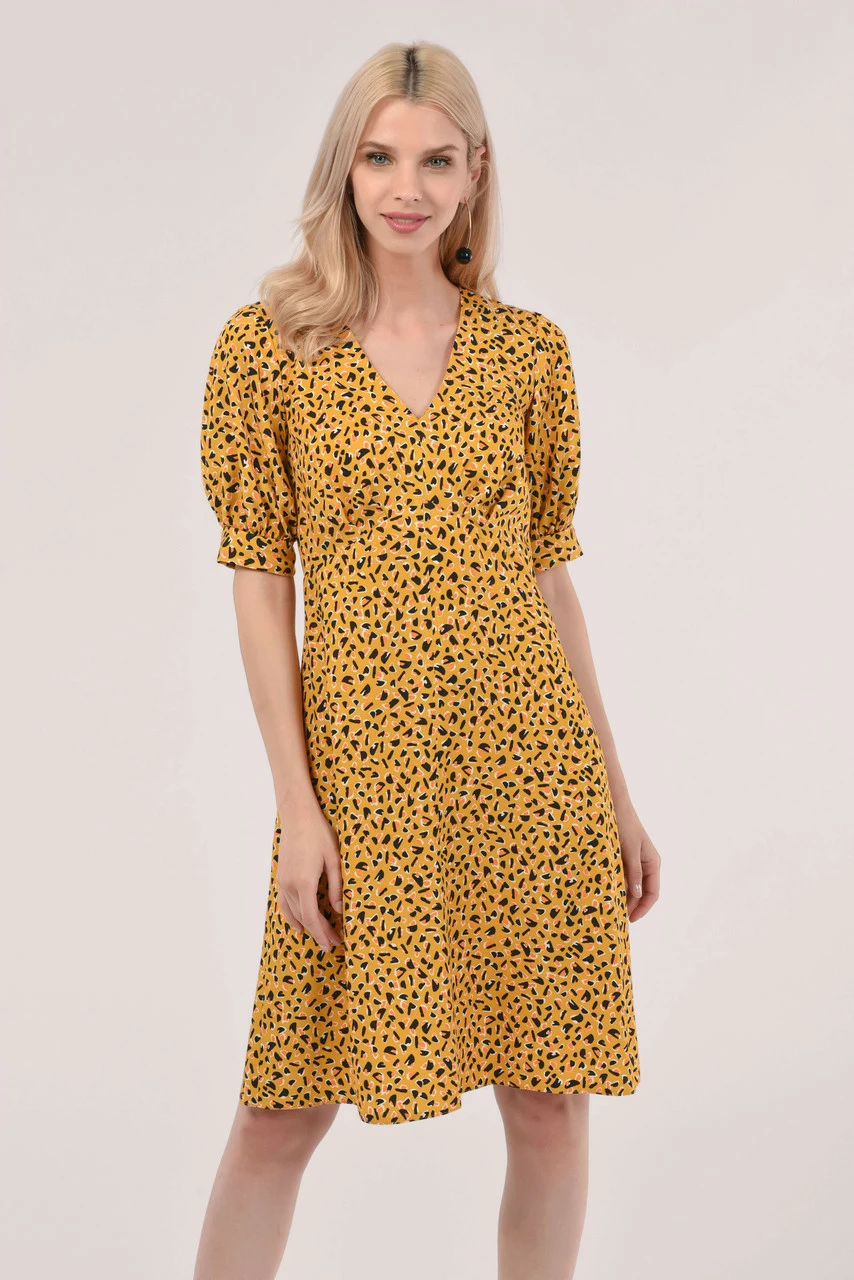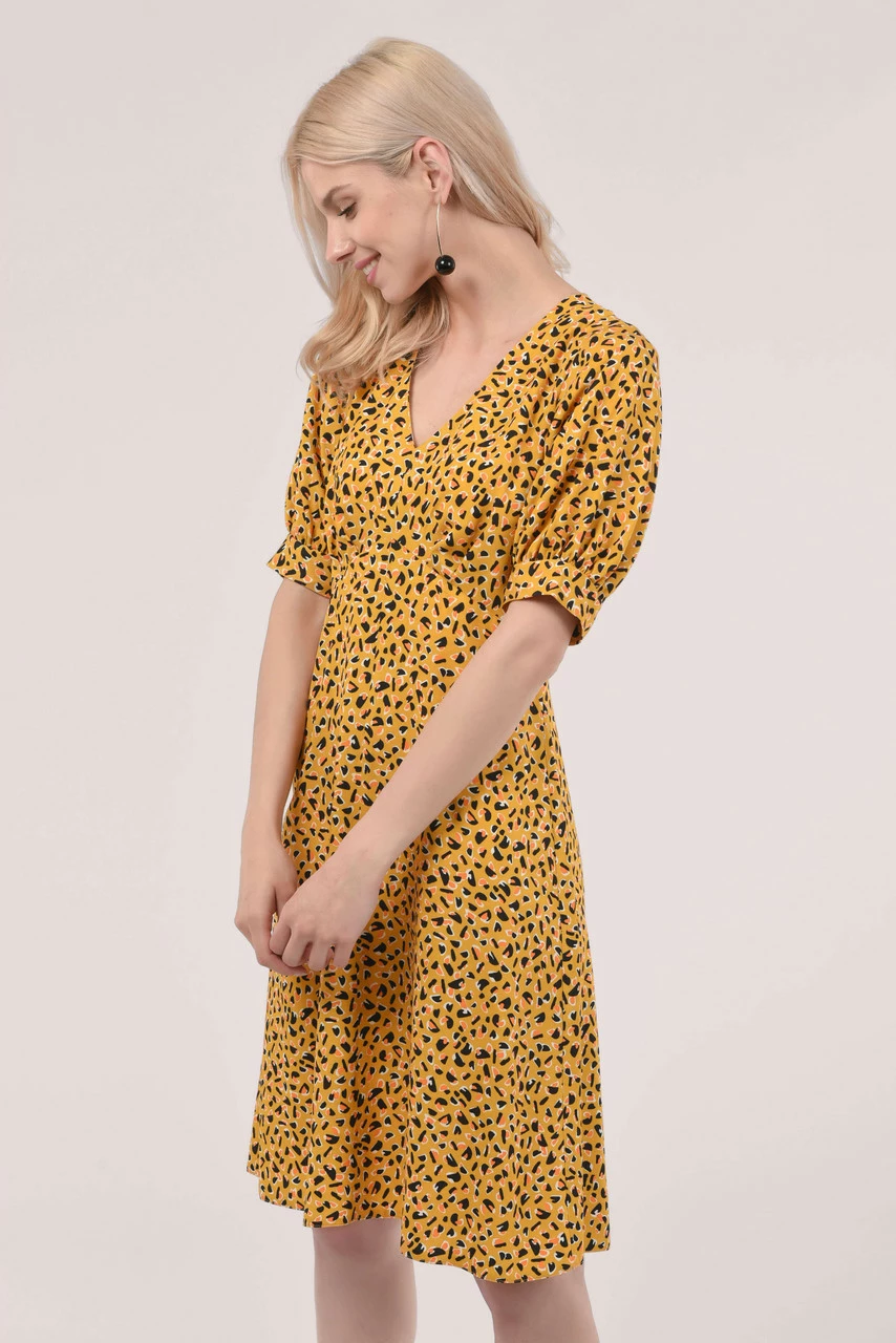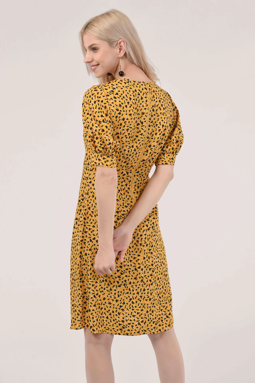 Details: Puff sleeves, Gathers at waist, Mini dress, Animal print, Cuff detailing, A-line silhouette