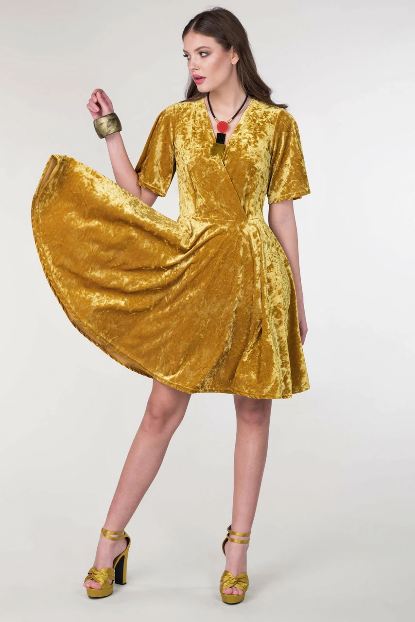 This wrap-front dress has a shiny velvet material. The flared skirt makes it an interesting piece. Warranty-Fields: