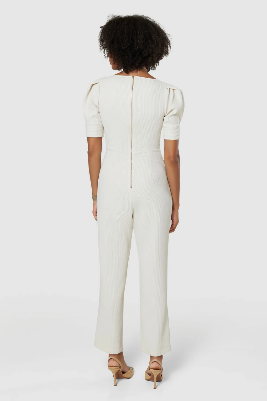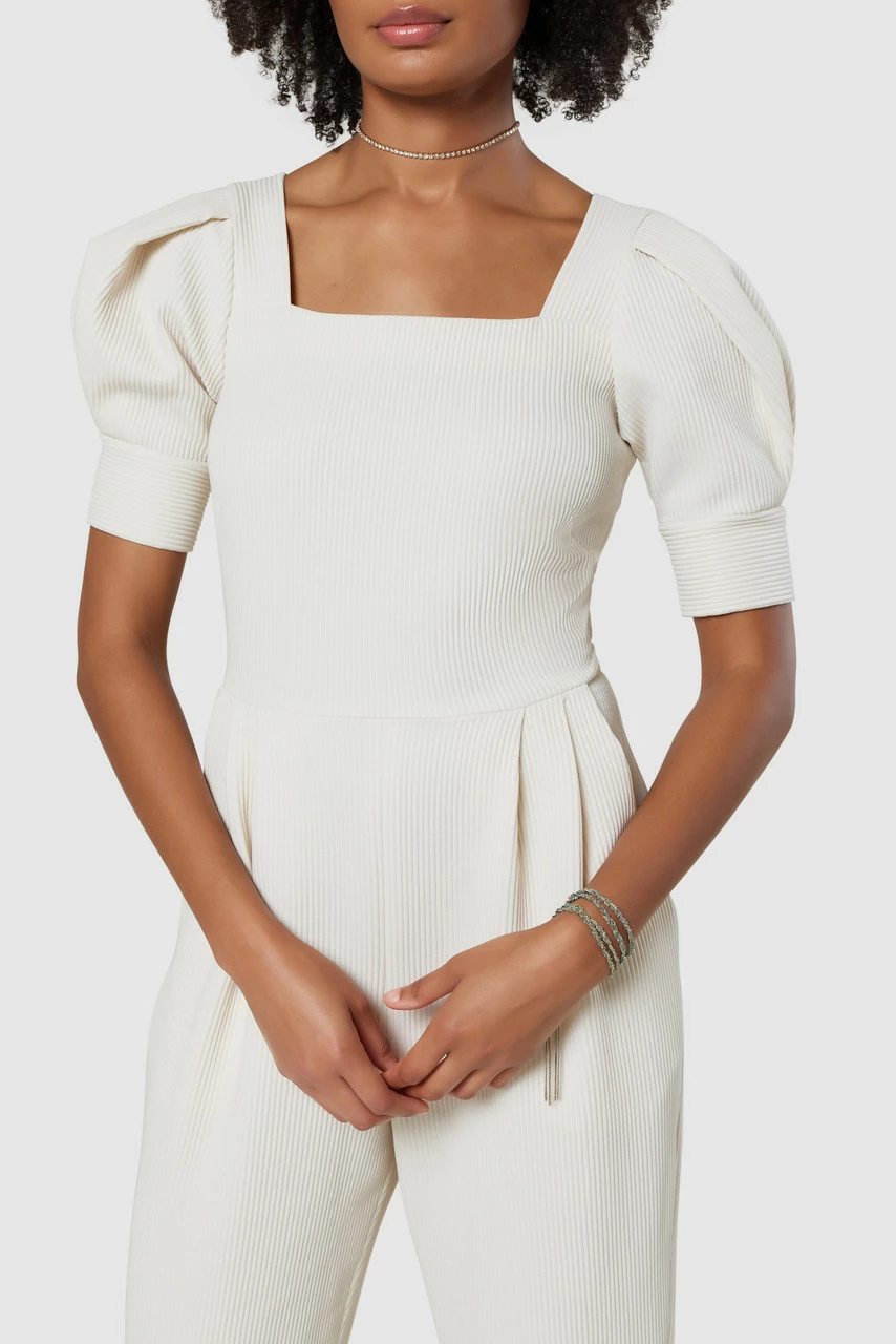 Jumpsuits are easy to wear, and this one in the Jumbo rib with a square neckline, pleated trousers, and sleeves is sure to turn heads too.