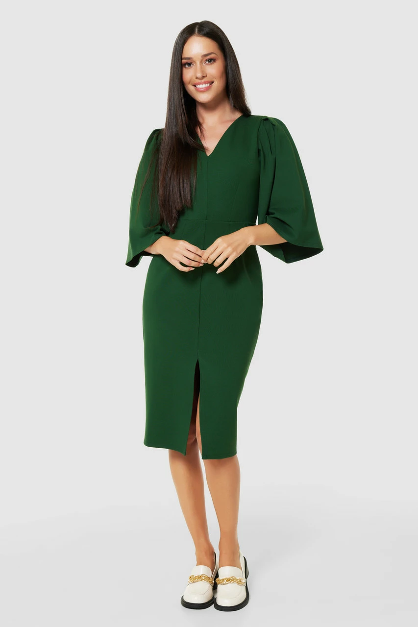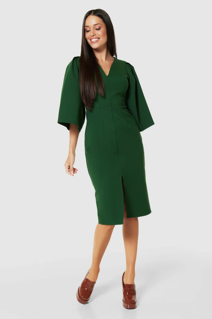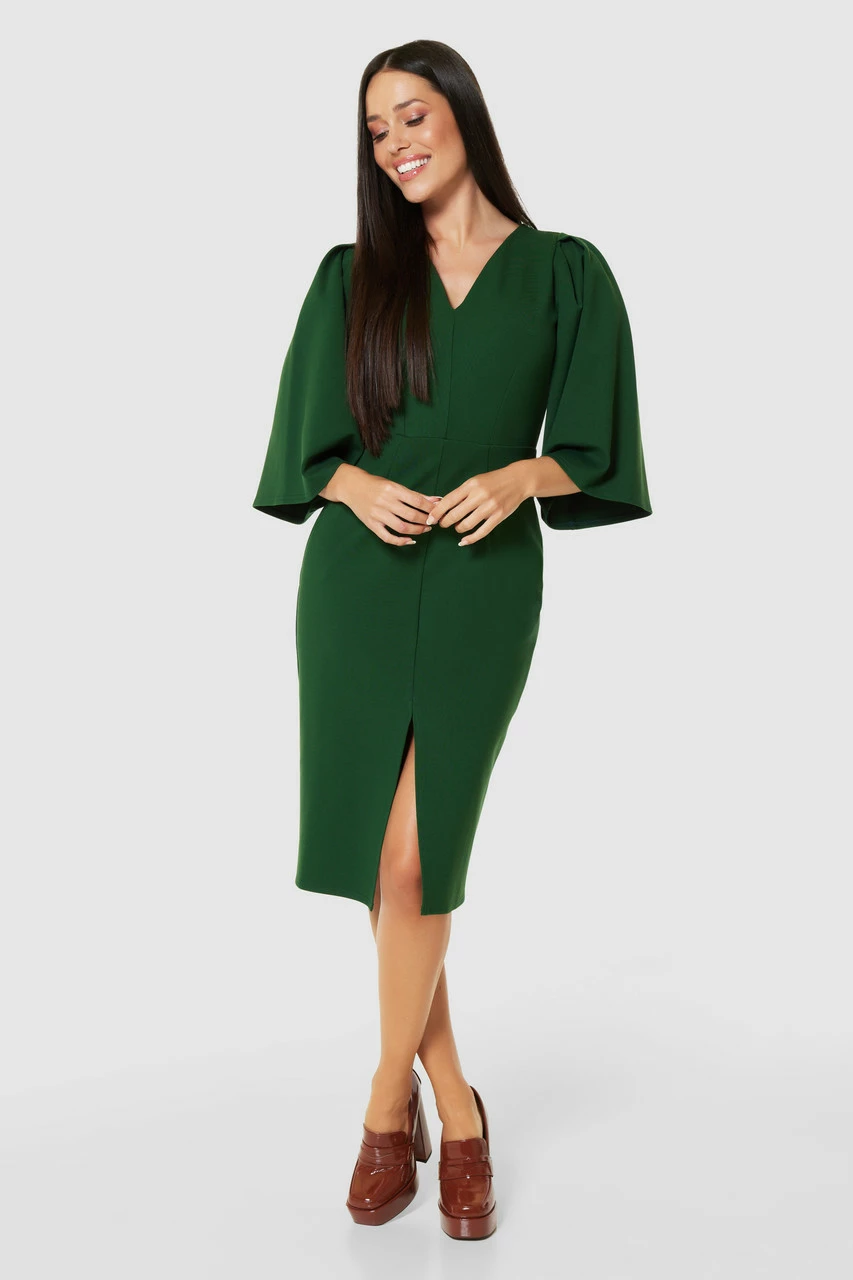 Details: Front cut split, Flared sleeves, Pencil silhouette, Round backline