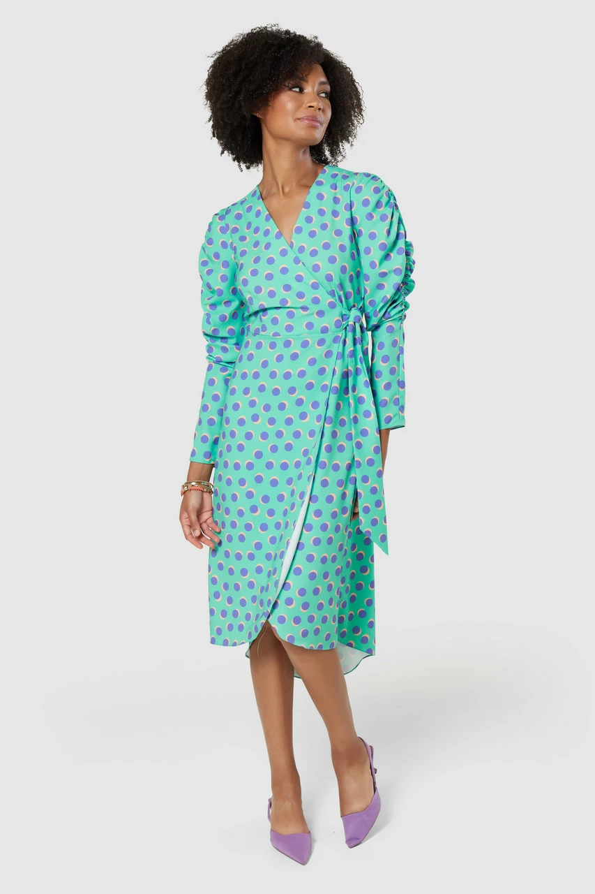 An effortless wrap dress in a pretty spot print has full-length draped leg of mutton sleeves