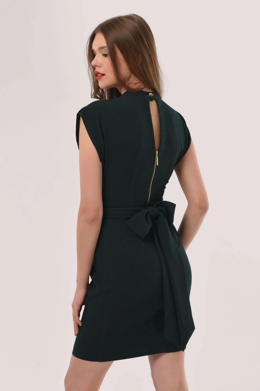 Details: Tie back waist, keyhole details, Cap sleeves, High collar, Mini dress, Wrap waist details