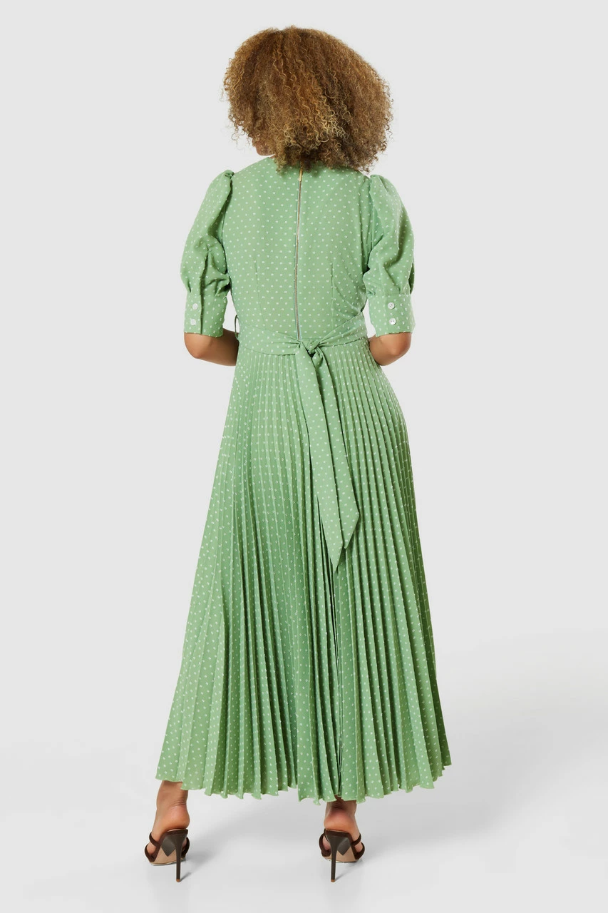 Dresses with full sunray pleated skirts have become a Closet London specialty This one in sage with a white dobby is pretty and flattering with its wrap front and puff sleeves.