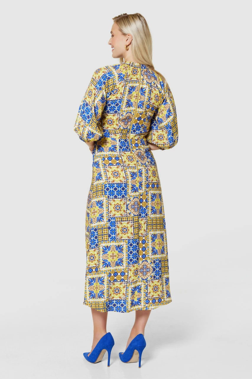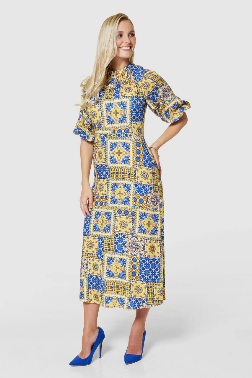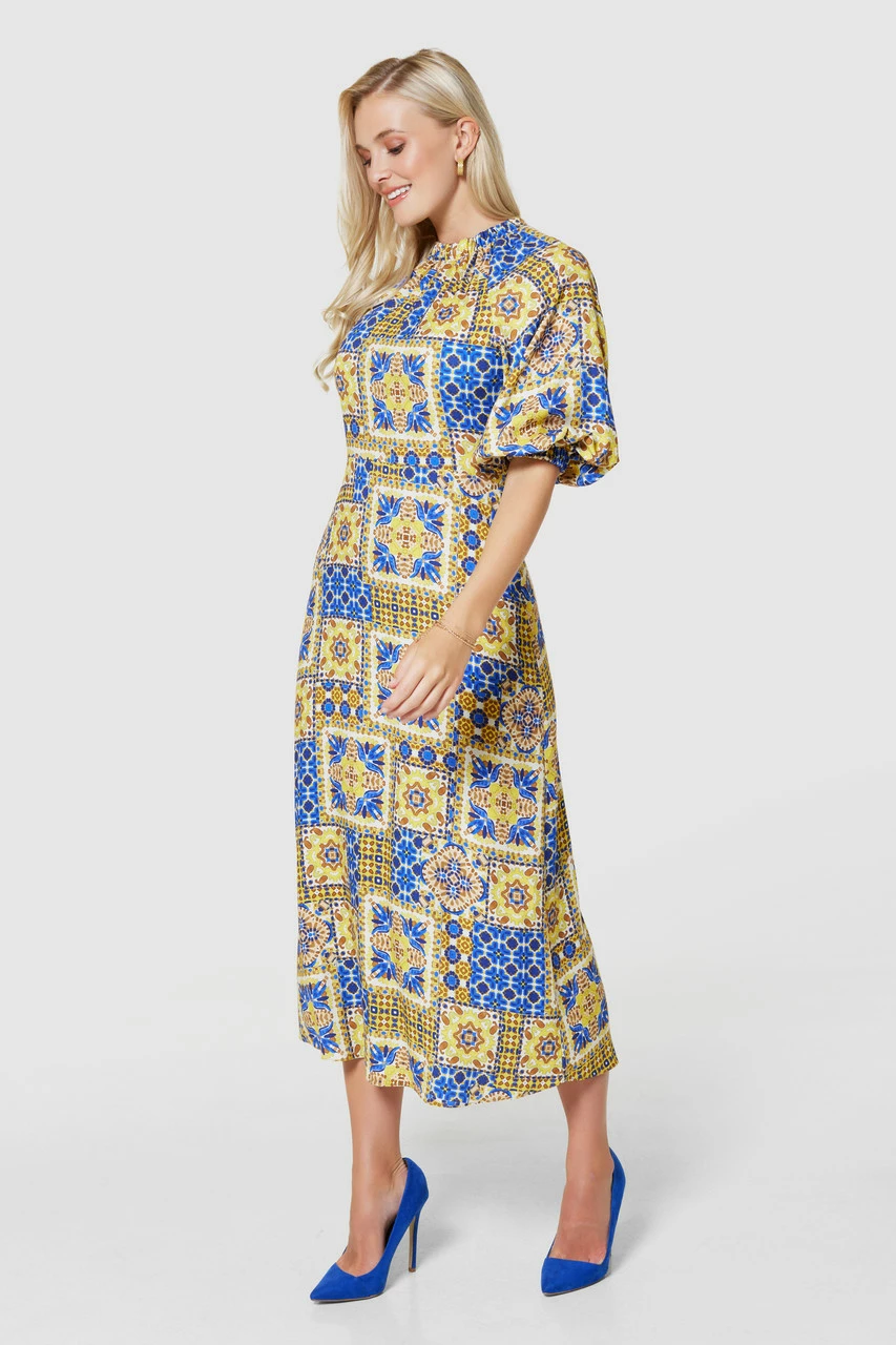 A feminine dress in a pretty title print on a viscose crepe. The neck is softly gathered, the balloon sleeves are elbow-length with elasticated cuffs, and it has a midi-length a-line skirt with splits.