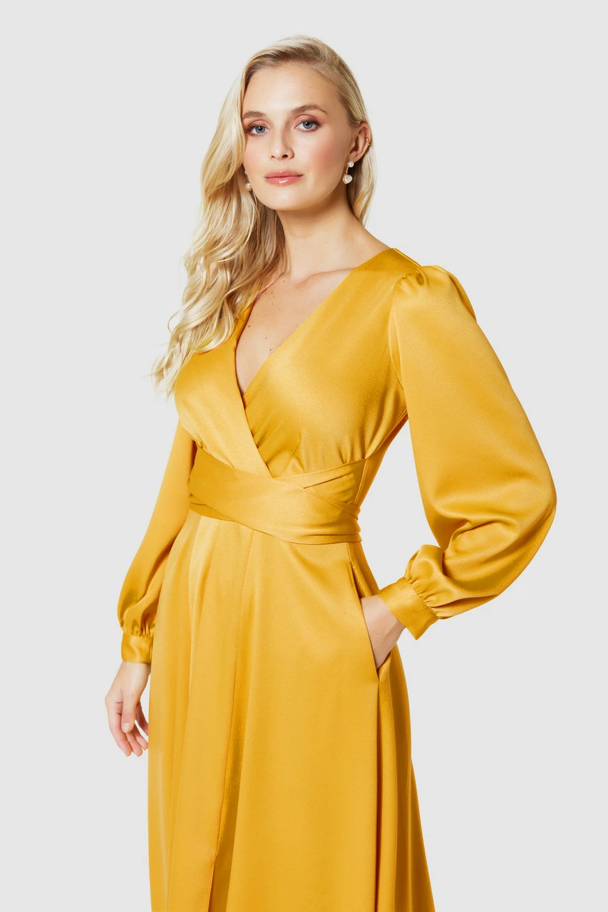We have taken our bestselling wrap dress, added a wrap around tie belt, long sleeves, and cut it in a yellow matt satin. And it has pockets! Perfect for winter weddings and christenings.