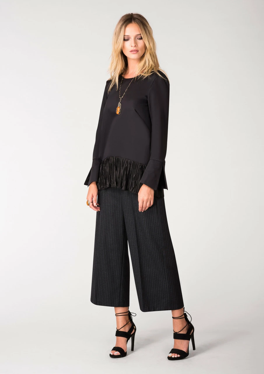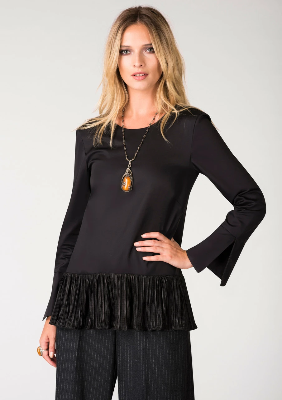 Details: V back neckline, peplum hem, Long sleeves, Cut split cuffs